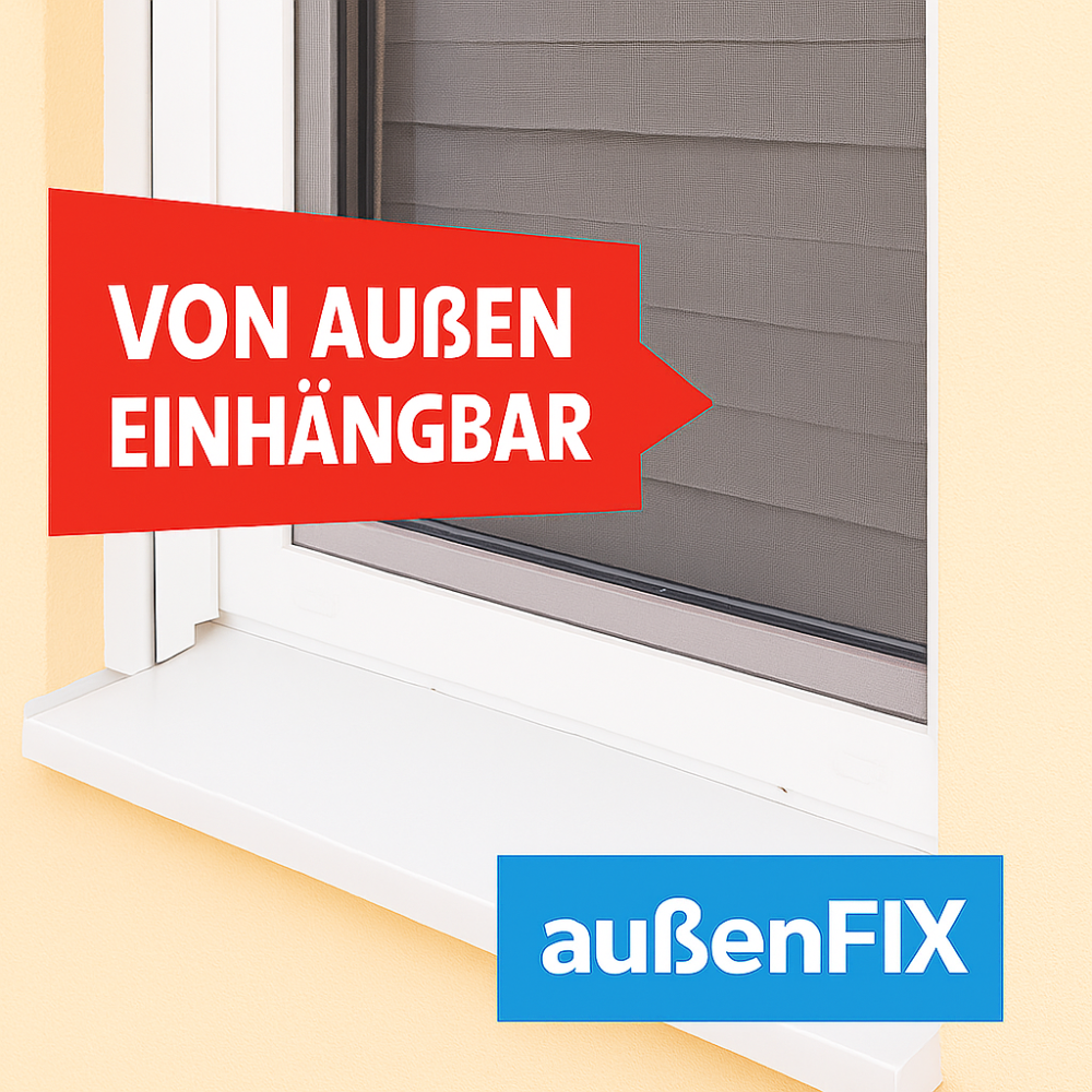 Der Mückenschutz außen-FIX ist die perfekte Lösung für Fenster, die nur von außen zugänglich sind – z. B. bei Kippfenstern, Küchenfenstern mit vorgelagertem Wasserhahn. Dieser Insektenschutz-Spannrahmen lässt sich vollständig von außen einhängen und sitzt sicher im Fensterrahmen – ganz ohne Bohrung oder Schrauben am Fenster.